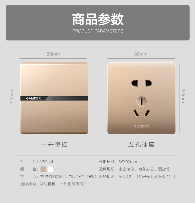 溫馨提示:gamderdingdi提供V8金詳細(xì)參數(shù)及V8金圖片,另對(duì)gamder家的開關(guān)插座V8香檳金色86型大面板LED一開五孔帶開關(guān)家用 商品的詳細(xì)介紹及說明負(fù)責(zé),如您對(duì)V8金產(chǎn)品描述、圖片等有疑問請(qǐng)點(diǎn)擊我要質(zhì)詢聯(lián)系V8金客服 我要咨詢